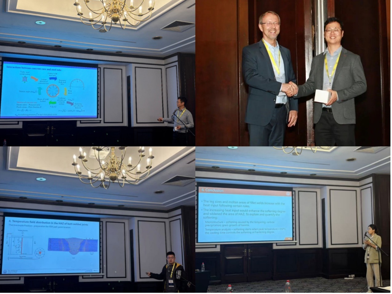 王彦博教授共同主持了会议的高强钢、高性能钢结构专题分会并做The load-bearing capacity of CFST columns with HSS materials considering the triaxial mechanical properties of concrete主题报告,系统阐述了考虑混凝土多轴受力特性下钢管混凝土柱承载力的研究方法和试验结果。博士生孙哲、郜一泽分别做高强钢焊接接头力学性能相关学术报告。